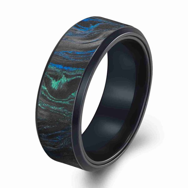 New Arrival Titanium and Forged Carbon Fiber Wedding Flat Band With Beveled Edges Men's ring with mixed blue and green Foil Images |